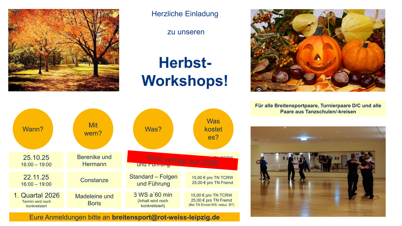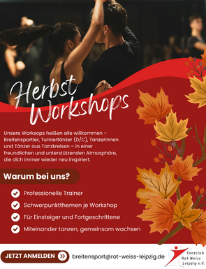 Egal ob Breitensportpaar, Turnierpaar der D/C-Klasse oder Tanzpaar aus einer Tanzschule bzw. einem Tanzkreis – dieser Workshop bietet für alle das passende Tanztraining und neue Impulse.