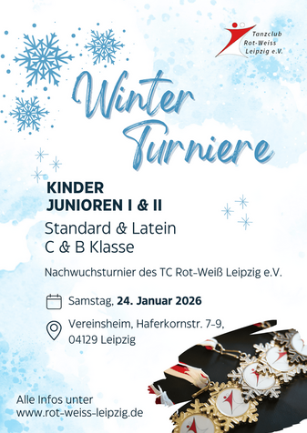 Am 24. Januar 2026 öffnen wir unsere eigenen Vereinsräume für die Winterturniere der Nachwuchsklassen: Kinder sowie Junioren I & II in Standard und Latein, C- und B-Klasse.